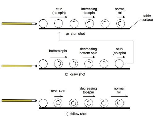 The different motion states of a ball are sliding, rolling, spinning and stationary. Different states can be created based on how and where the cue hits the ball (as seen in the image below).